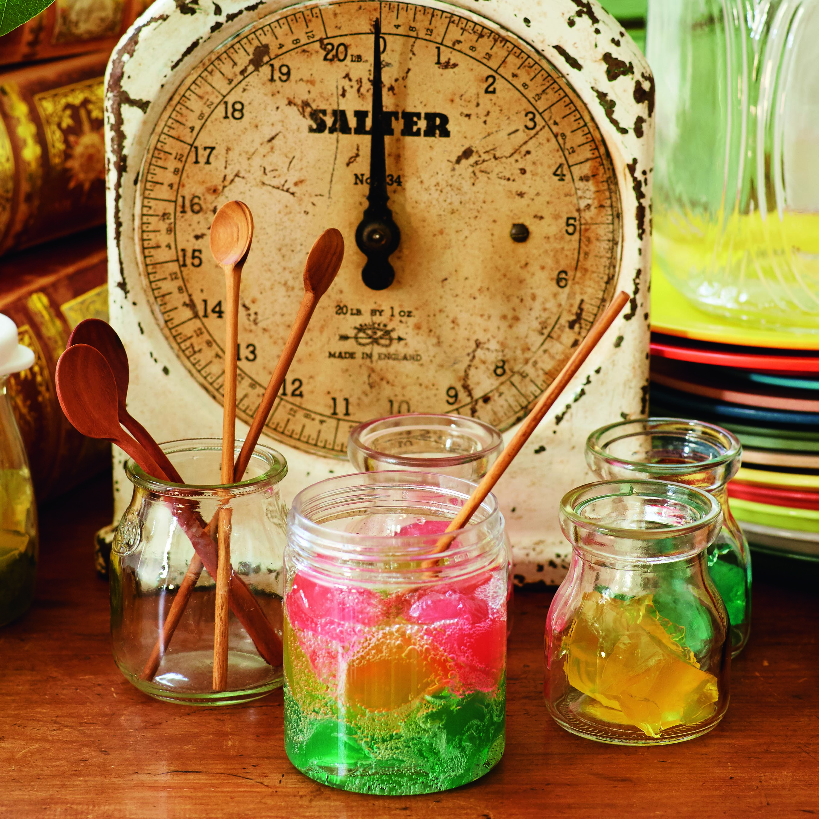 アーヤと黒ネコ・トーマスがこっそり作った「あらゆる魔法から身を守るじゅもん」をイメージした5色のゼリー。サイダーを注いで完成!