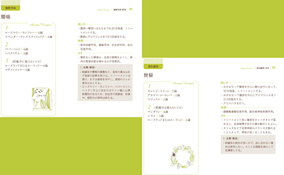 診療科・症状別メディカルアロマレシピ(循環器科/泌尿器科/整形外科/呼吸器科/耳鼻咽喉科 ほか)/精油紹介(アカマツ・ヨーロッパ/イランイラン/ウィンターグリーン/オレンジ・スイート/カモミール・ジャーマン ほか)