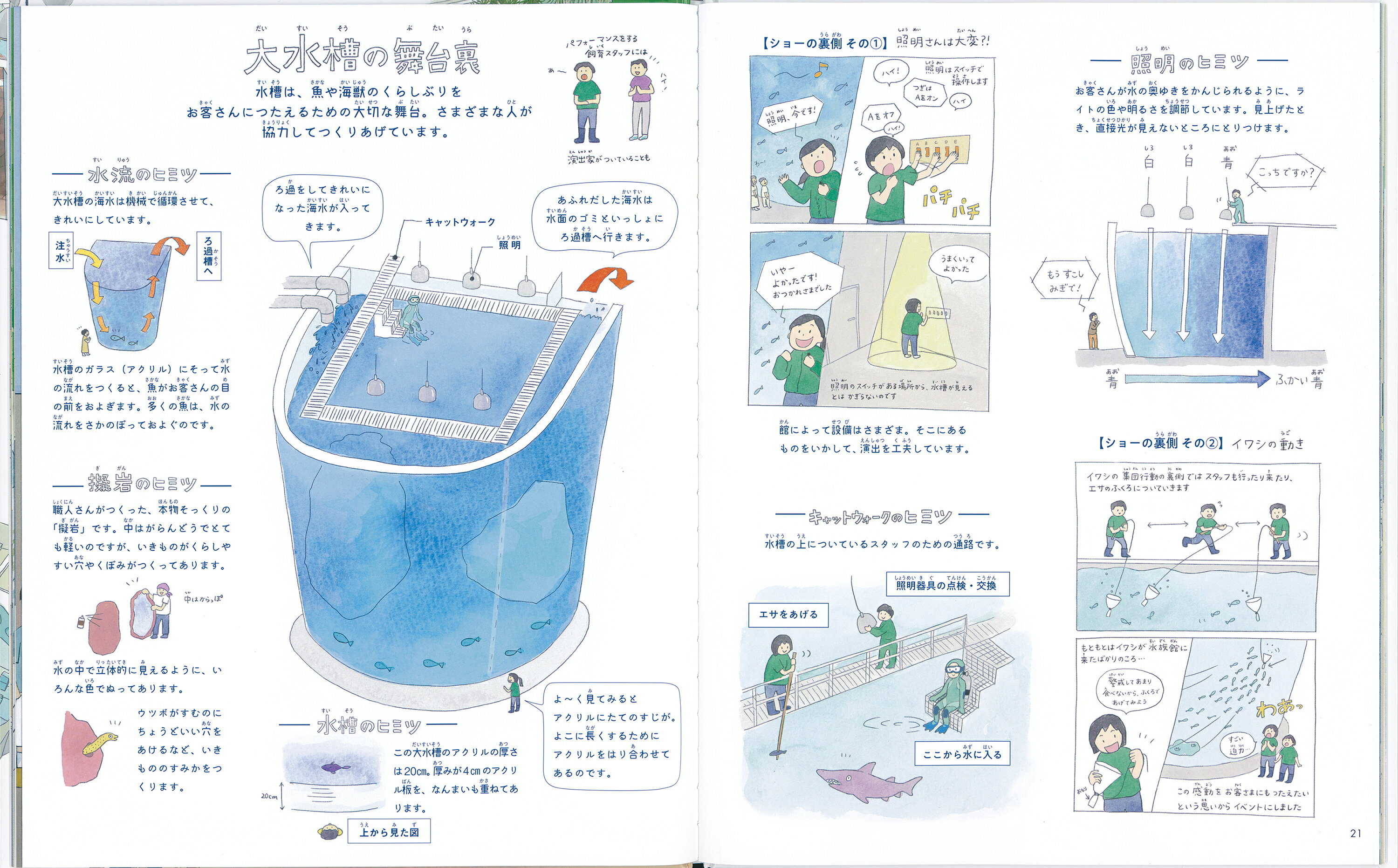 実際に水族館を訪れたような気分で読み進むと、ところどころにおりこまれたページが。めくってみると、普段はみられない舞台裏をのぞくことができます。
