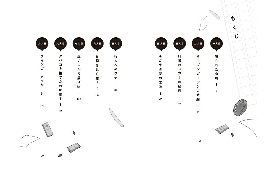 隠された金塊/オープンガーデンの悲劇/36番ロッカーの秘密/あかずの間の宝物/犯人へのワナ/目撃者は亡霊?/迷いこんだ届け物/タバコを捨てたのは誰?/フィンガーメッセージ
