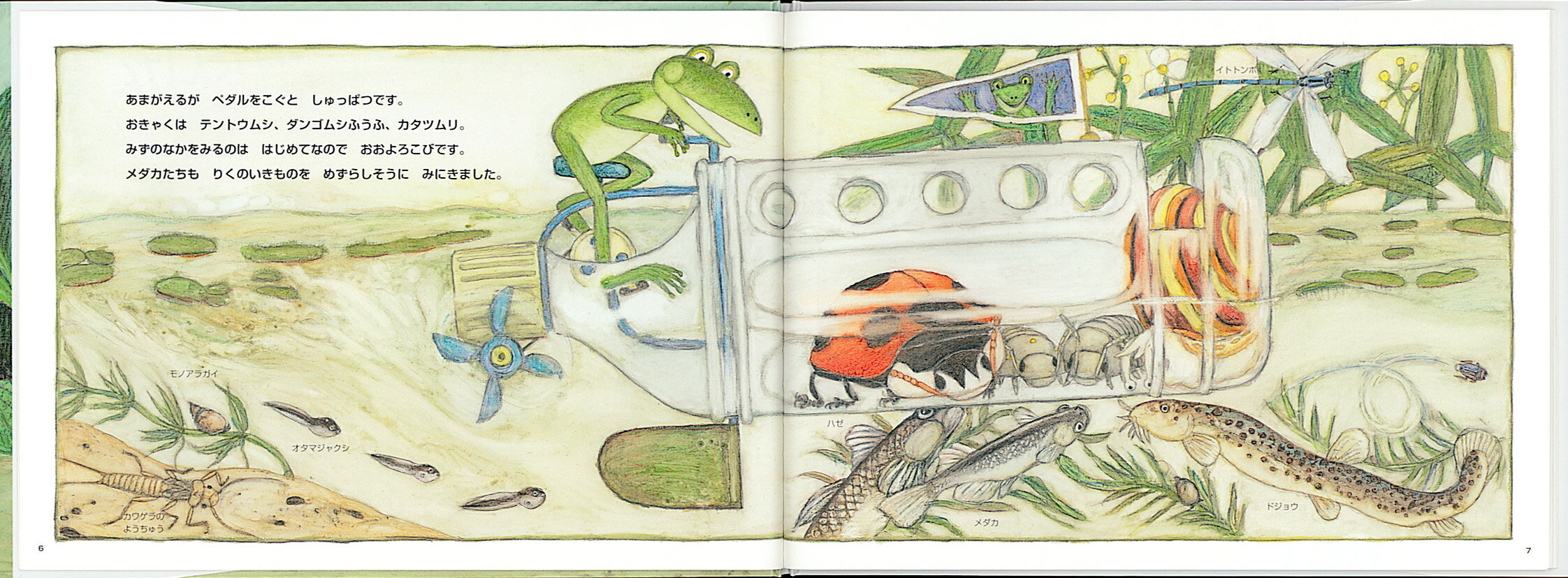 ツアーコンダクターのあまがえる君が、ペットボトル製のボートで陸上の昆虫をトンボ池探検に案内します。お客はテントウムシ、ダンゴムシ、カタツムリ。お父さんが背中で子育てするコオイムシ、肉食のこわい昆虫たち、小魚や昆虫のにぎやかな世界。陸上の生き物にとって水の中の世界は、初めて体験することばかり。楽しさと驚きがいっぱいです。