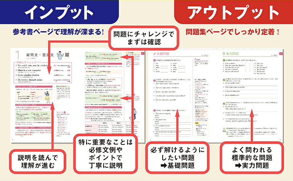 解説を読んで理解を深め、要点を覚えたら、すぐ問題演習ができるので効果的に学習が進められます。中学英文法の学習がこの一冊で完結できます。復習や学び直しにもおすすめです。