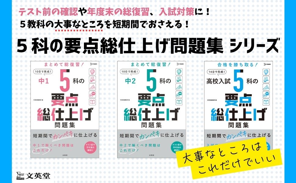 参考書『高校入試 5科の要点整理』と同じ配列にしています。問題集でわからなかったところ,間違えたところは,参考書でしっかり復習し,弱点を1つ1つ克服しましょう。