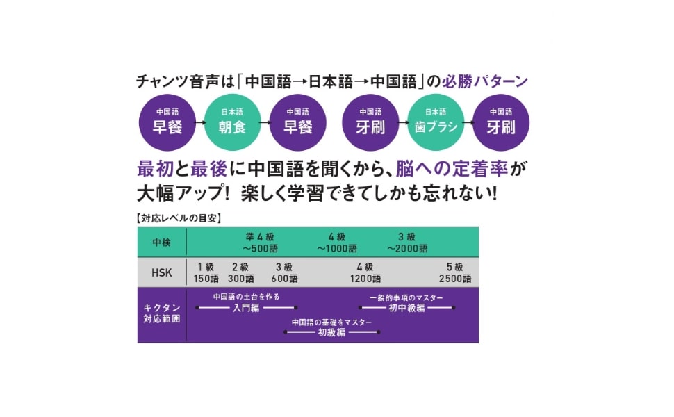 キクタンと言えば、音楽のリズムに乗りながら楽しく単語の学習ができる「チャンツ」。「目」と「耳」から同時に単語をインプットすることで記憶に定着するだけでなく、難しいと言われる中国語の発音や、日本人が苦手とするピンイン・声調を覚えるのにも効果抜群! 文字・発音・ピンイン・声調を「目」と「耳」から一緒に覚えましょう。