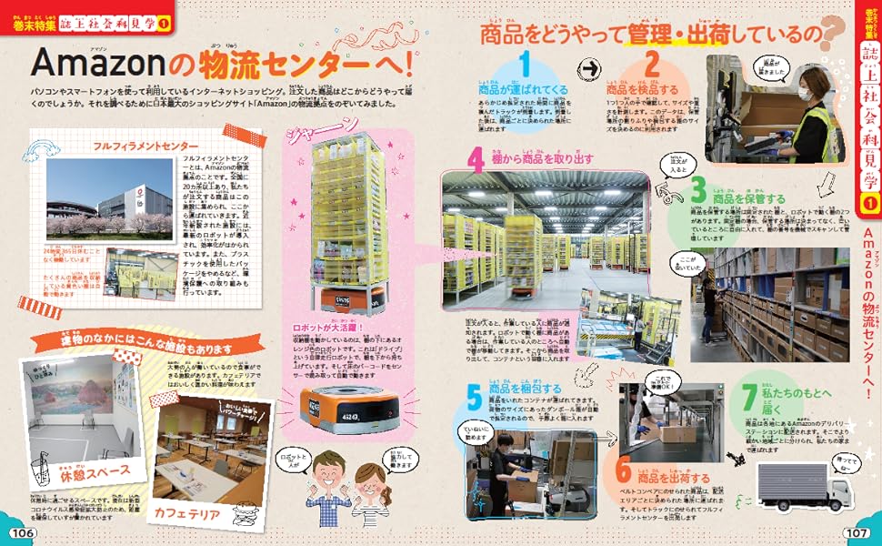 ・巻末特集では日本最大のショッピングサイト「Amazon」や首都圏の食生活を支える「豊洲市場」がどのようになっているのか、気になるあの場所を誌上社会科見学で紹介。