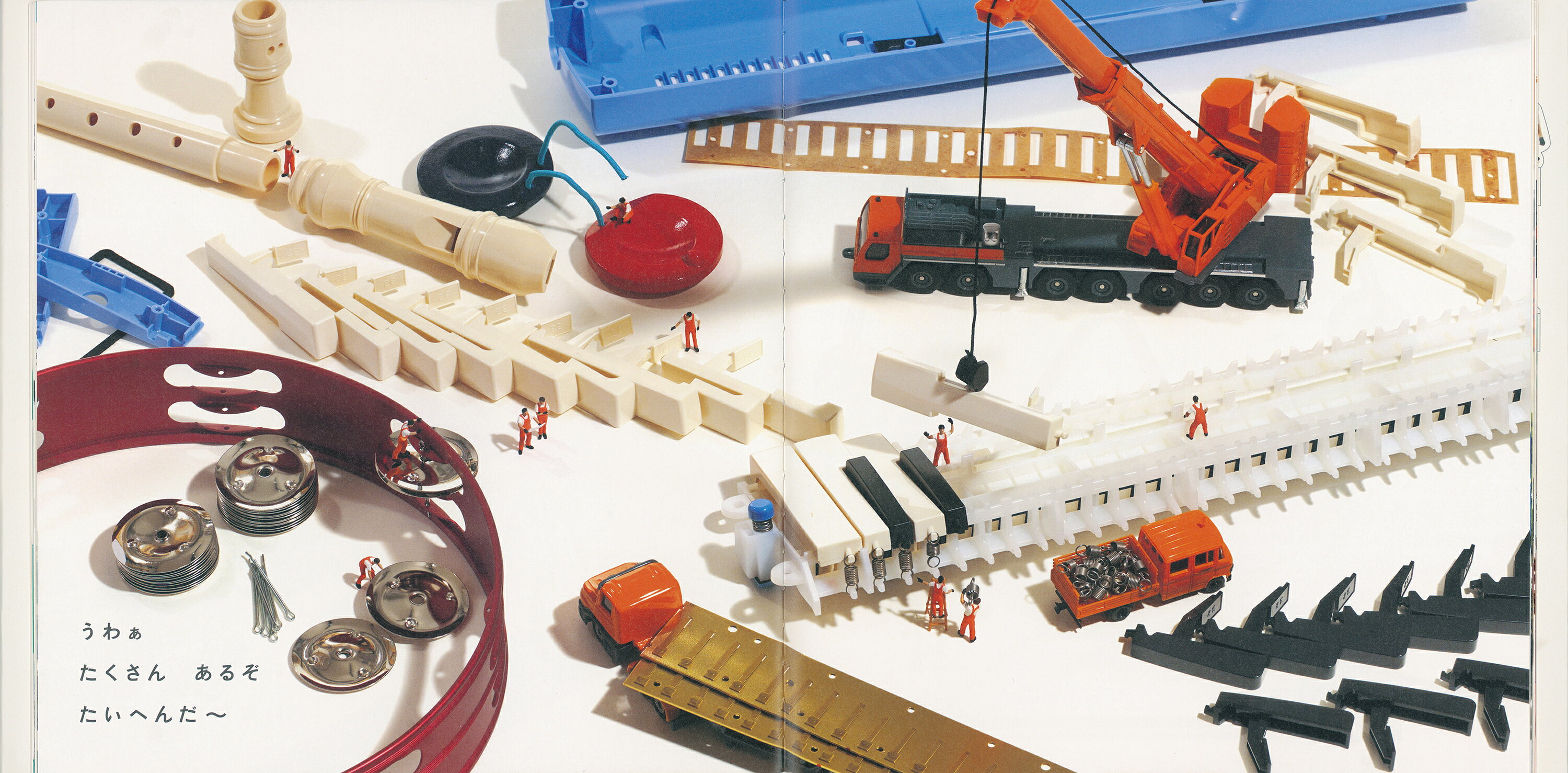分解された状態の日用品。それをミニチュアの作業員たちが、せっせと組み立てます。