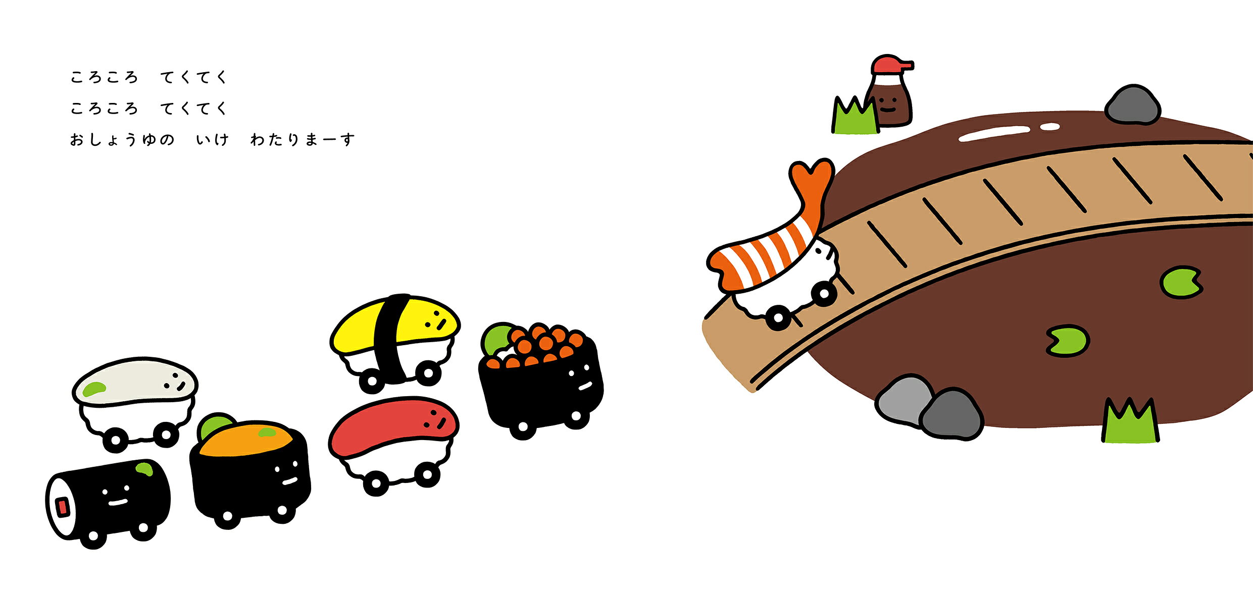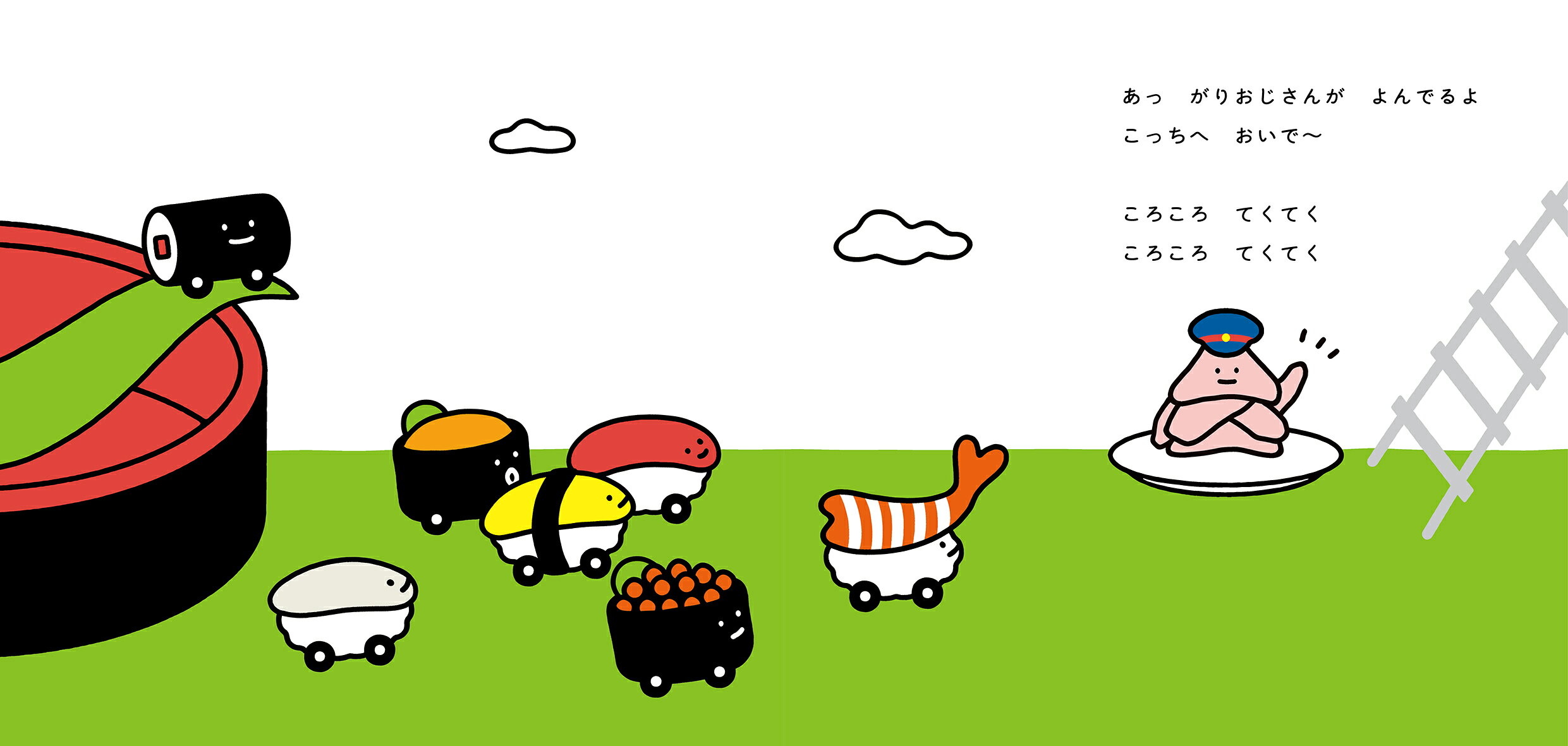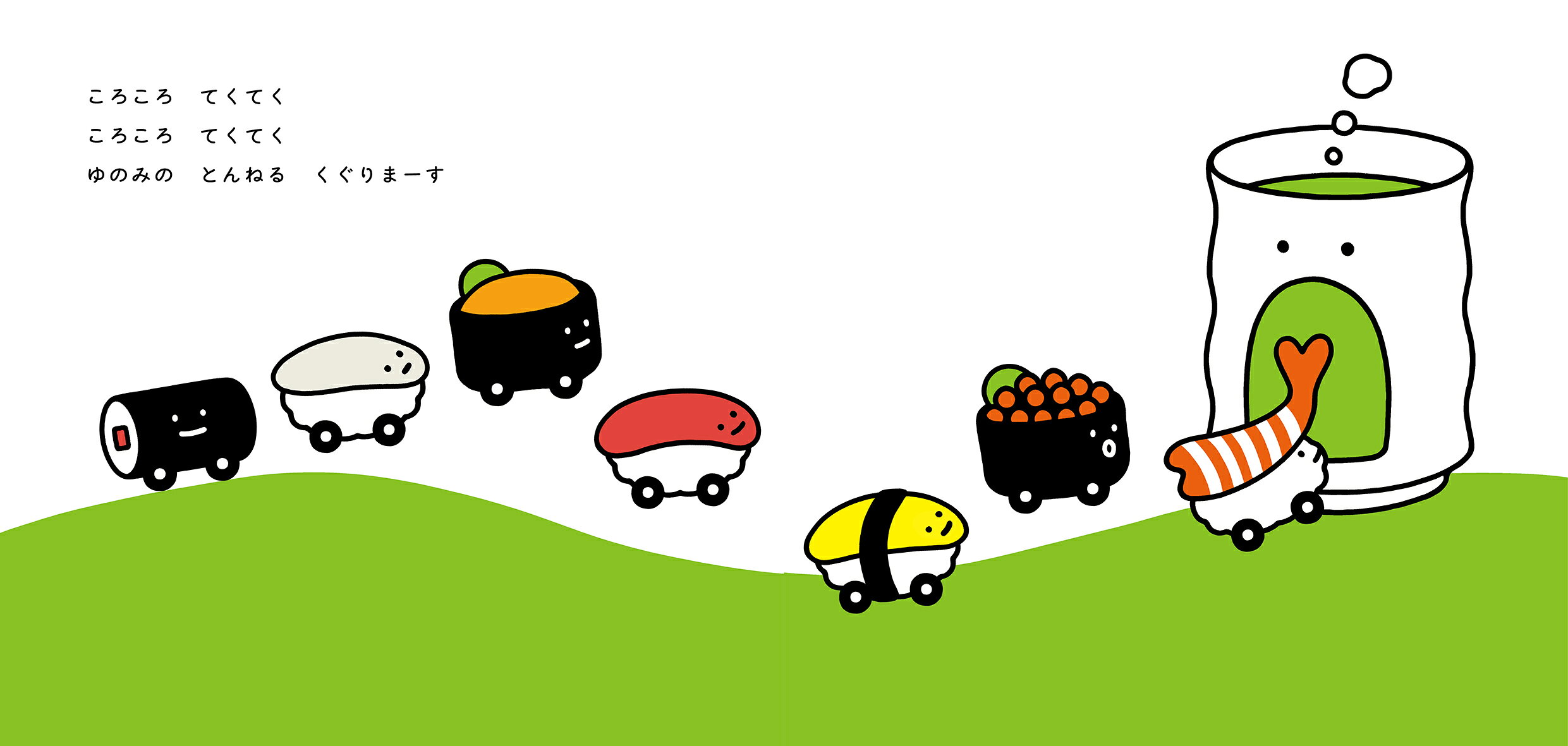 えび・いくら・たまご・まぐろ・うに・いか・てっかまき……お寿司がかわいい”のりもの”になったグラニフの大人気キャラクター「スシトレイン」の絵本第1弾! スシトレインたちが、列になって「ころころ てくてく」と”おさんぽ”にでかけると、ドキドキと発見の連続。さあ、スシトレインの小さな冒険のはじまりです。しゅっぱーつ!