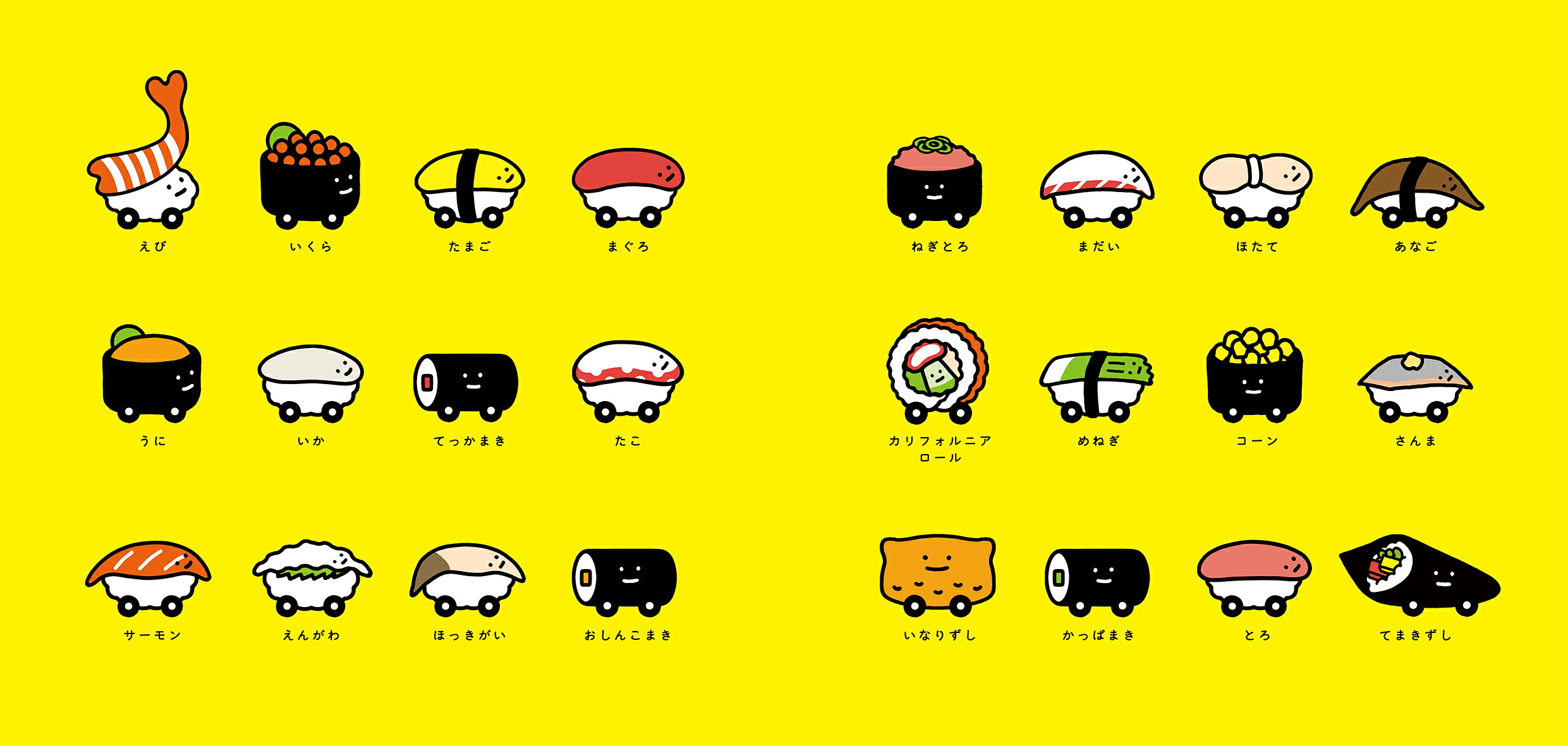 「ゆのみとんねる」、「おしょうゆのいけ」、「すしげたはうす」などのスポット、スシトレインが苦手な「わさびこぷたー」、見守ってくれる「がりおじさん」などのキャラクターが登場。お寿司屋さんで出会う独自の道具、専門用語が自然と覚えられます。