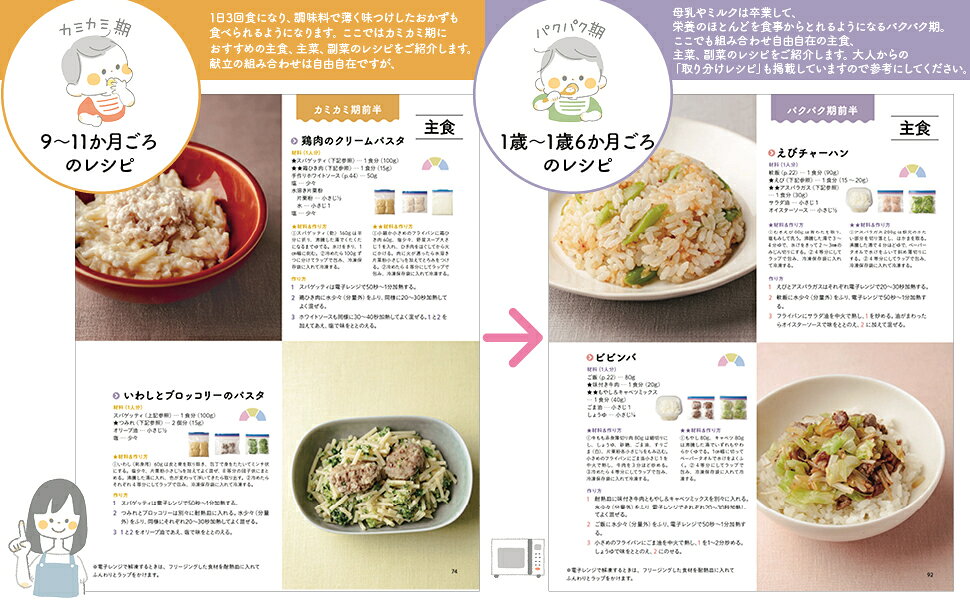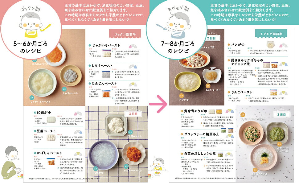 1 食材&成長期別 形状・下ごしらえ・フリージングテク(炭水化物食材/ビタミン・ミネラル食材 ほか)/2 ゴックン期(5〜6か月ごろ)のレシピ 献立編(ゴックン期前半/ゴックン期後半)/3 モグモグ期(7〜8か月ごろ)のレシピ 献立編(モグモグ期前半/モグモグ期後半)/4 カミカミ期(9〜11か月ごろ)のレシピ おかず編(カミカミ期前半/カミカミ期後半)/5 パクパク期(1歳〜1歳6か月ごろ)のレシピ おかず編(パクパク期前半/パクパク期後半 ほか)