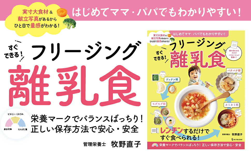 離乳食をはじめてつくる、離乳食ではじめて料理に挑戦するといったはじめてパパ&ママでも安心して作れる離乳食のレシピ本。料理器具や保存容器についてはもちろん、基本の調理方法を丁寧に紹介。フリージング(冷凍作りおき)を活用することで日々の離乳食作りがラクになる。素材の冷凍だけでなく、離乳食後期では味つけされたものをフリージングしておくと解凍するだけですぐに食べられるから料理家事の負担を軽減できる!