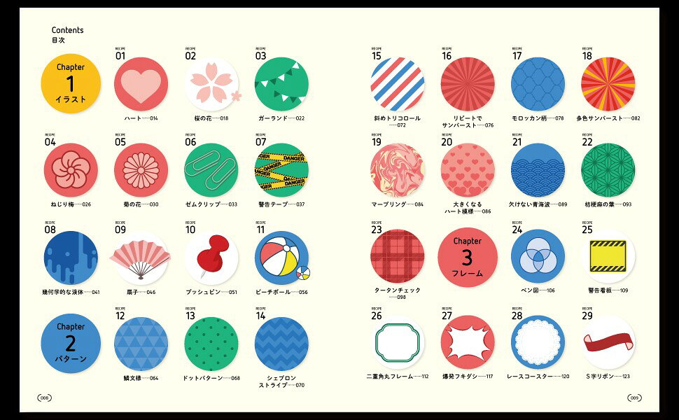 豊富な図説と動画で、「イラスト」「パターン」「フレーム」「タイトル」の44レシピを解説。