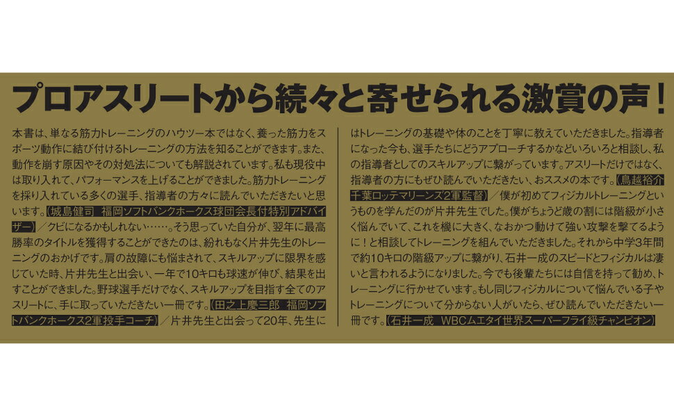 本書を、ウエイトトレーニングの指導に携わっている指導者の方、プロ・アマ問わずウエイトトレーニングを行っているアスリート、またトレーニング指導者を目指している学生の皆さんの参考にしていただき、競技力向上や身体づくりのための一助になれば、筆者にとってこれほど嬉しいことはありません。