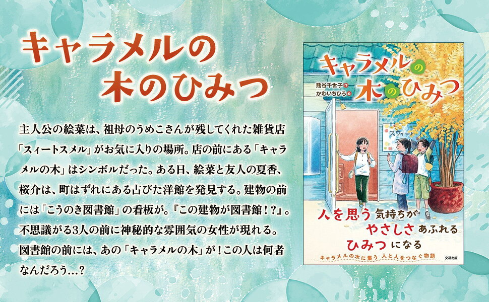 主人公の絵菜は、祖母のうめこさんが残してくれた雑貨店「スィートスメル」がお気に入りの場所。店の前にある「キャラメルの木」はシンボルだった。ある日、絵菜と友人の夏香、桜介は、町はずれにある古びた洋館を発見する。建物の前には「こうのき図書館」の看板が。『この建物が図書館!?』。不思議がる3人の前に神秘的な雰囲気の女性が現れる。図書館の前には、あの「キャラメルの木」が!この人は何者なんだろう…?キャラメルの木に集う人と人をつなぐ感動の物語!!
