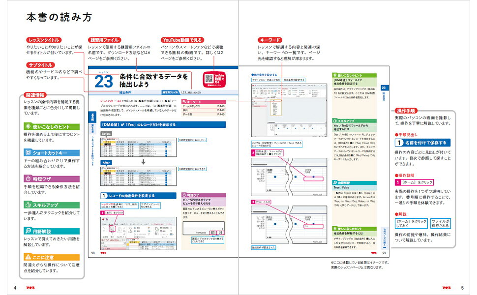 基本編(Accessの基礎を学ぼう/テーブルを作成しよう/クエリでデータを抽出しよう/データを入力するフォームを作ろう/レポートで情報をまとめよう)/活用編(リレーショナルデータベースを作るには/入力しやすいフォームを作るには/複雑な条件のクエリを使いこなすには/レポートを見やすくレイアウトするには/マクロで画面遷移を自動化するには ほか)