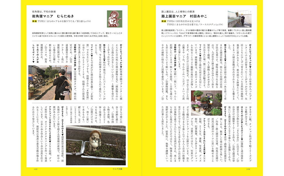 ドジっ子看板マニア・赤沼俊幸/商店街マニア・あさみん/片手袋マニア・石井公二/電線マニア・石山蓮華/路線図マニア・井上マサキ/空想地図マニア・今和泉隆行(地理人)/バックヤードマニア・今井夕華/峠の鉄道の歴史マニア・上原将太/歩行者天国マニア・内海皓平/顔ハメ姿マニア・裏パネの人/いぬくそ看板マニア・うんこ看板/小屋マニア・遠藤宏/カラーコーンマニア・おかだゆか/鉄塔マニア・加賀谷奏子(鉄塔ファン)/ガラスブロックマニア・ガラスブロックマニアック/まちのチャーミングマニア・木村りべか/旧町名マニア・旧町名をさがす会 102so/電気風呂マニア・けんちん/室外機マニア・斎藤公輔(NEKOPLA)/電飾マニア・サイバーおかん/火曜サスペンスごっこマニア・さかもツインねね/顔ハメ看板に自分がハマって写真を撮るマニア・塩谷朋之/アート系壁マニア・シガキヤスヒト/野良サインマニア・ちかく/ゴムホースマニア・中島由佳/松田ペット看板マニア・新稲ずな/ドボクマニア・八馬智/道に落ちているもの(落ちもん)マニア・藤田泰実/珍スポットマニア・松澤茂信/マニアのマニアによるマニアのためのアパレルマニア・マニアパレル/野良イスマニア・Mr.tsubaking/路上園芸マニア・村田あやこ/街角狸マニア・むらたぬき/ドネルケバブマニア・メルツのドネルケバブログ/散歩マニア・ヤスノリ/平成レトロマニア・山下メロ