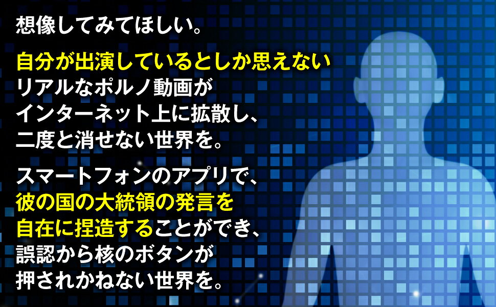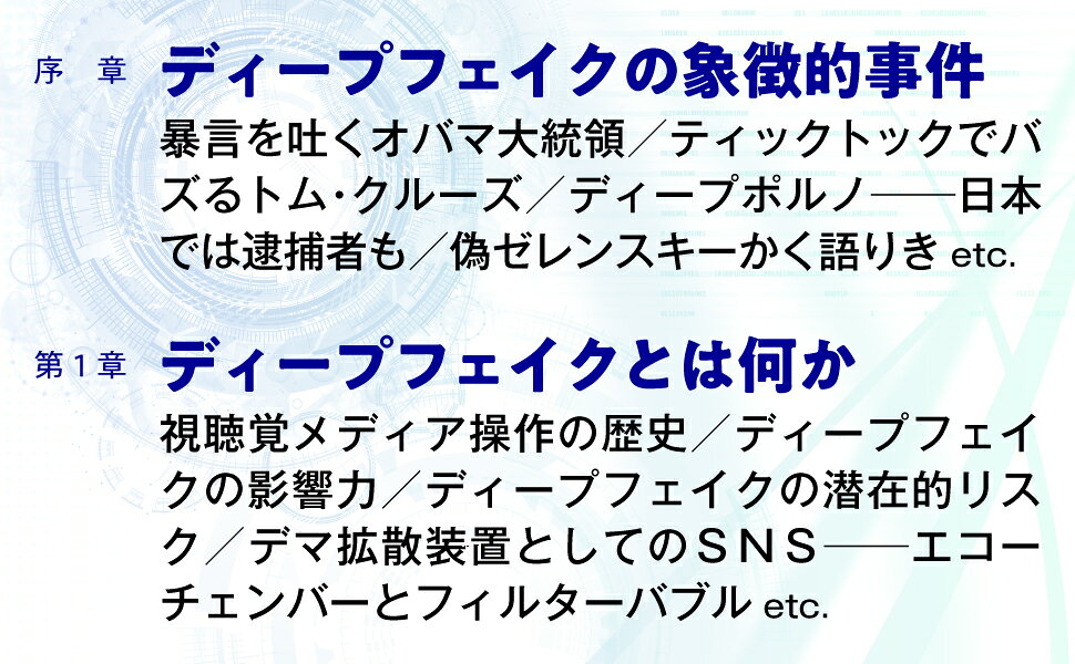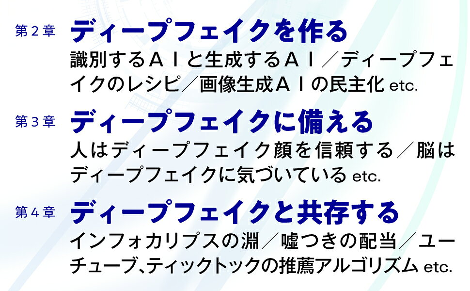 序章 ディープフェイクの象徴的事件(見ることは信じること/ディープフェイクス現わる ほか)/第1章 ディープフェイクとは何か(ディープフェイクの定義/見ることは信じることではなくなったとき ほか)/第2章 ディープフェイクを作る(弱いAIと強いAI/AIの定義 ほか)/第3章 ディープフェイクに備える(人はディープフェイク顔を信頼する/脳はディープフェイクに気づいている ほか)/第4章 ディープフェイクと共存する(インフォカリプスの淵/嘘つきの配当 ほか)