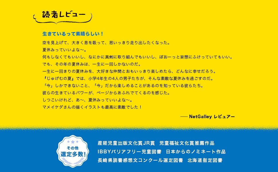 四年生の夏休みにやりたいことを宣言した、筋ジストロフィーの親友、かっちゃん。かっちゃんのねがいをかなえてあげたくて、ぼくらは綿密に計画をねったのだけれど…。夏のにおいが濃く立ちこめる山あいの村で、いのちを謳歌する少年たちのすがたをみずみずしく描く。