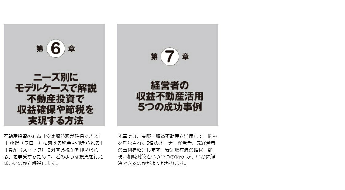 第1章 「不動産投資」が経営の安定と節税に効果的な理由/第2章 不動産投資の基礎理論と「指標」の知識/第3章 最適な投資ポートフォリオ構築のためのエリアと物件の選び方/第4章 不動産投資を有利に進めるファイナンス戦略/第5章 安定収益を実現する物件運営の極意/第6章 ニーズ別にモデルケースで解説 不動産投資で収益確保や節税を実現する方法/第7章 経営者の収益不動産活用 5つの成功事例