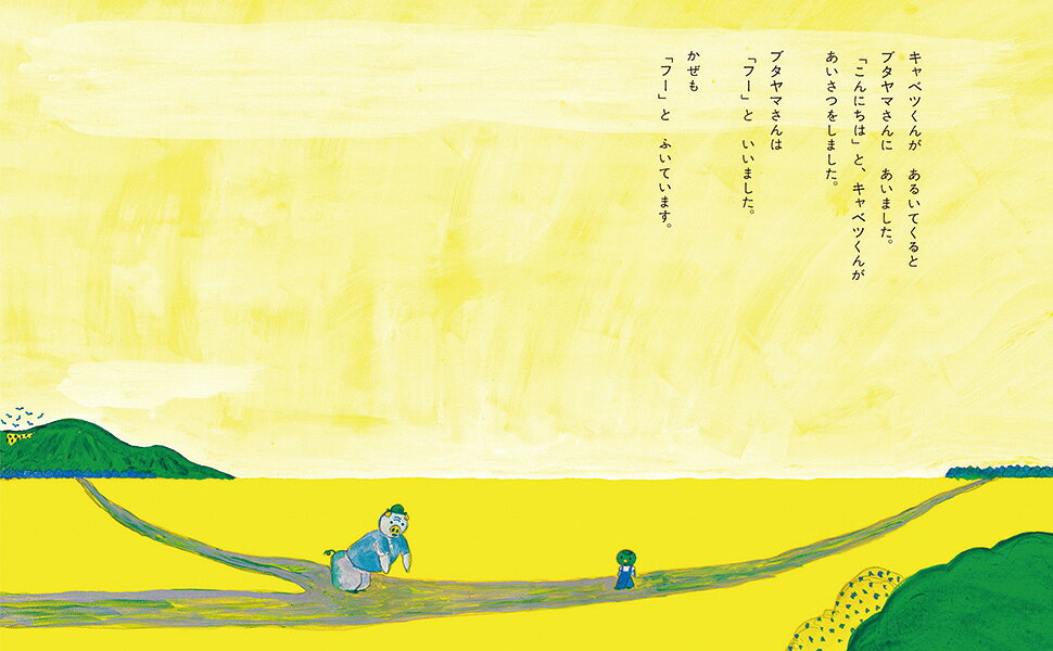 ![]() キャベツくんが道を歩いていると、向こうからやってきたのはブタヤマさん。ブタヤマさんはお腹が空いてフラフラです。キャベツくんが「こんにちは」と挨拶をしても、返ってくる返事は、「フー」。ところがブタヤマさんは、あまりにもお腹が空き過ぎて、次の瞬間にはキャベツくんをつかまえて、こんな事を言うのです。「キャベツ、おまえをたべる!」だけど、キャベツくんは慌てません。「ぼくをたべると、キャベツになるよ!」すると空には、鼻がキャベツになっているブタヤマさんが浮かんでいます。「ブキャ!」これには驚きの声をあげるブタヤマさんでしたが……。長新太さんの不思議な世界が存分に楽しめるこの絵本。だけど難しいことは何もありません。ひたすらキャベツを食べたいブタヤマさんと、驚かせ続けながらも少しだけ同情してしまう人が好いキャベツくんの、愉快なやり取りの繰り返しなのです。ブタヤマさんが「ブキャ!」と言うたびに、笑ってしまえばいいのです。(だって面白いんだもん)地平線まで見えるような地面に、黄色く広がる大きな空。遠くには山々が連なって。そこから一本の道がずーーっと伸びていて……。なんでしょうね、この解放感。ここにいるだけで、心が晴れてくるようです。そんな道の向こうからやってくるのは、小さな可愛い「キャベツくん」。ああ、ブタヤマさんじゃなくたって、私だってきっと話かけてしまうはず。「こうなる!」と言って、体の一部がキャベツになっている変な動物を次々に見せてもらいたい。そんな風に彼に夢中になってしまった皆さまがた。ご安心ください、キャベツくんはシリーズ全5冊。この摩訶不思議な世界がどんどん続いていきますよ!覚悟してくださいね。 (絵本ナビ編集長 磯崎園子) ![]() おはなしかいで読んでいます。 こどもがよろこぶ動物や乗り物が出てくるお話では指をさしたりゲラゲラ笑ったり、○○すきーと言ったりにぎやかなことが多いのですが・・・。 キャベツくんを読む時はいつも静かです。タイクツなのかと心配するほどに静かですが、こどもたちは息をつめて成り行きを見守っているようです。キャベツのクジラが画面いっぱいに広がった時にはハッとかあっとかいう小さな息がいくつか聞こえてきます。 何度か読みましたが、メンバーが変わっても似たような反応があります。読み終わったあとに「ブキャ!」と言ってケラケラ笑う声も聞こえます。 キャベツくんの吸引力はすごいです。(Flappeさん 40代・その他 ) 【情報提供・絵本ナビ】 |