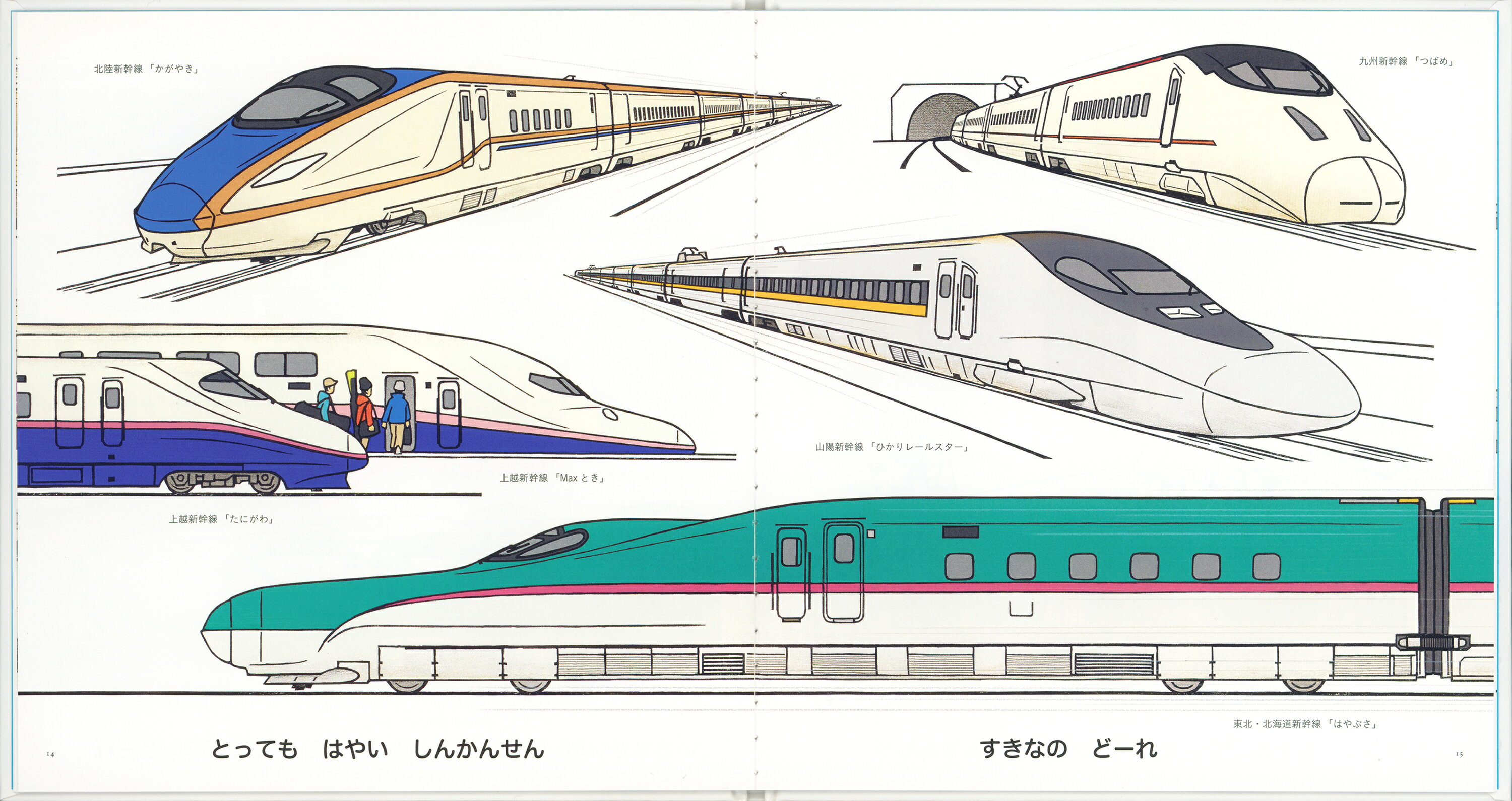 いろんな顔の電車があるね。やさしい顔の電車に、おこった顔の電車。すきなのどーれ。いろんなかたちの電車があるね。窓のかたちもみんなちがうよ。色や模様も、赤だったり黄色だったり、花柄だったり、それぞれにちがってる。いちばんすきなの、どーれ。版画で刷った絵を貼りかさねて画面を作る手法で、たくさんの電車が図鑑的に描かれます。お気に入りを親子で指さしながら読むのが楽しい絵本です。