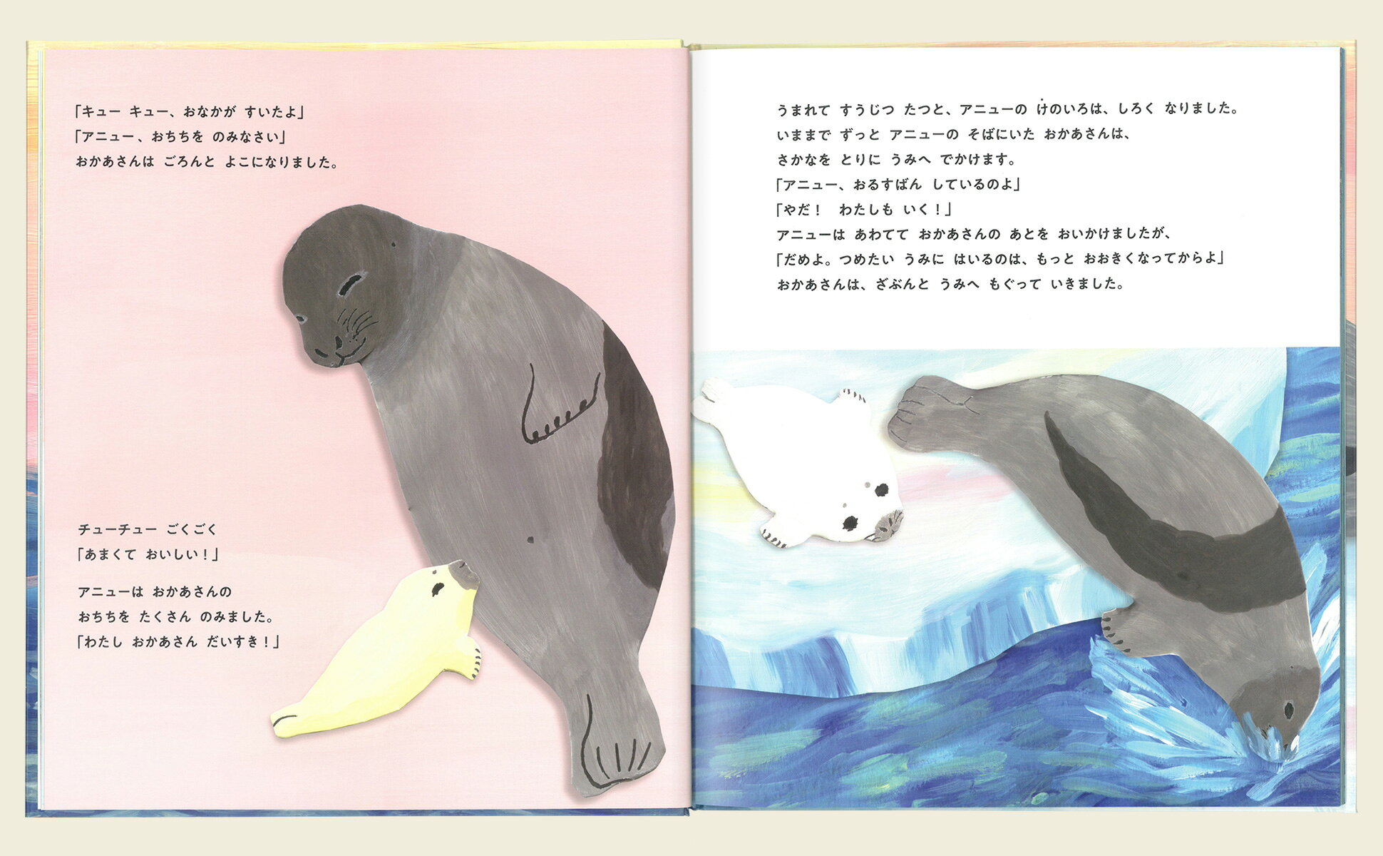 さむい冬のある日。地球の北のほうにある海の氷の上で、タテゴトアザラシのあかちゃんがうまれました。おかあさんはあかちゃんに、アニューとなまえをつけました。アニューは、おかあさんのおちちをのんですくすくそだちます。ある日、おかあさんがうみにでかけると……。