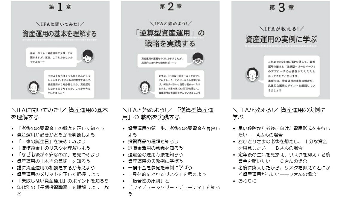 第1章 IFAに聞いてみた!資産運用の基本を理解する(「老後の必要資金」の概念を正しく知ろう/資産運用が必要かどうかを判断しよう/「一家の誕生日」を決めてみよう ほか)/第2章 IFAと始めよう!「逆算型資産運用」の戦略を実践する(資産運用の第一歩、老後の必要資金を算出しよう/投資商品の種類を知ろう/退職金活用の意義を知ろう ほか)/第3章 IFAが教える!資産運用の実例に学ぶ(早い段階から老後に向けた資産形成を実行したいーAさんの場合(30代男性)/おひとりさまの老後を想定し、十分な資金を用意したいーBさんの場合(40代男性)/定年後の生活を見据え、リスクを抑えて老後資金を賄いたいーCさんの場合(50代女性)/老後に突入したから、リスクを抑えてとにかく安全な資産運用がしたいーDさんの場合(60代男性))