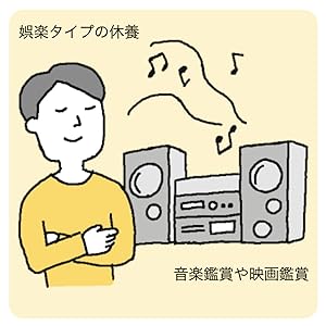娯楽タイプは、趣味嗜好を追求する休み方です。 クラシック音楽が好きならクラシック音楽を聞く。映画が好きなら映画を見る。いつも 休みの日にしていること、自分のやりたいことはすぐに思い浮かぶでしょう。それを主体的におこなうのが娯楽タイプの休養です。(中略)