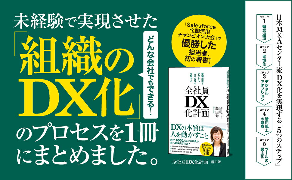 DX化の推進のためにSaaSの導入を検討する会社は多いですが、ツール導入後の運用・定着に躓き、求めるDXの効果を出しきれないケースも多く存在します。その中で、日本M&AセンターでSalesforceの活用推進を担当した著者は、たった1人から営業組織改革を実施。本書では、この改革で行った5ステップに分けて解説し、社員がDXに向けて自ら動き出すために必要なことを伝えます。