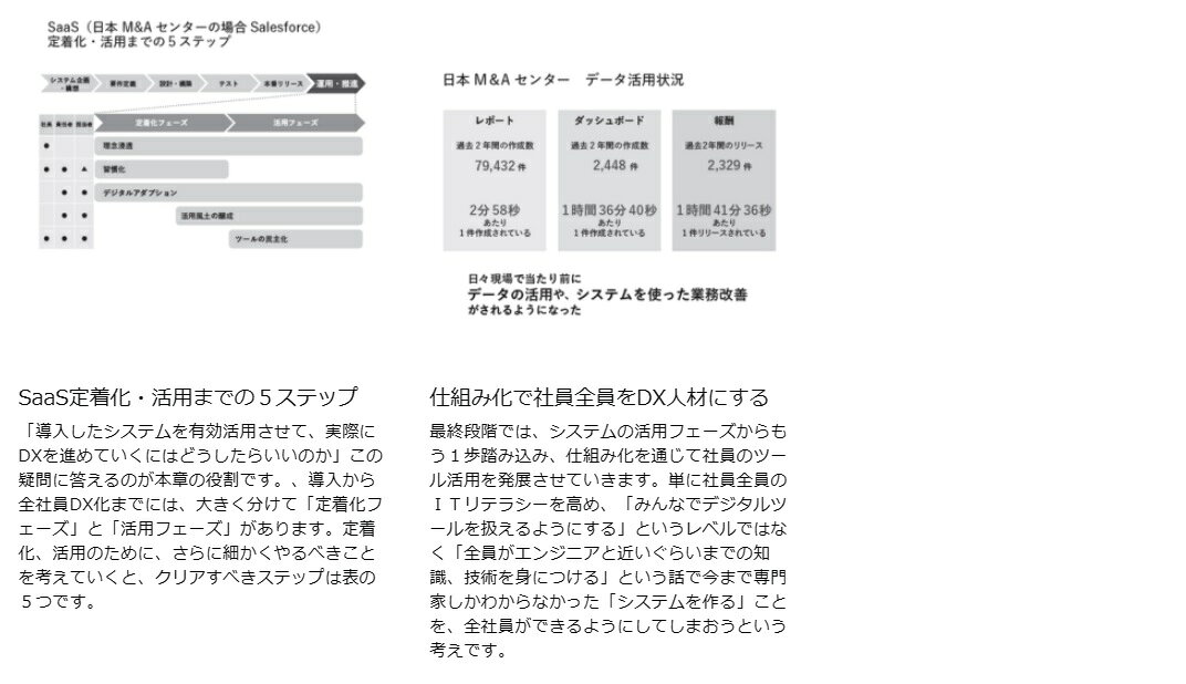 第1章 なぜ、あなたの会社のDXは進まないのか(DXはわかりづらすぎる/DXへの焦りと加速するSaaS導入 ほか)/第2章 日本M&Aセンターが急成長できた理由(2014年、日本M&Aセンター「Salesforce」導入/営業情報の蓄積にかける社長の想い ほか)/第3章 SaaS導入〜活用 5つのステップ(STEP1 理念浸透 全社で「DXを進める目的」の共通認識を持つ/STEP2 習慣化 システムの「必要性」を作るための運用ルール ほか)/第4章 世の中のDXを次のステップへ(トップダウンのDXから、ボトムアップのDXへ/DX化のカギは「人を動かす」こと ほか)/第5章 人の力は社会を変えるー日本DX人材センターの設立(集大成としての社内DXコンテスト/未経験だからこそ、イノベーションは興せる ほか)