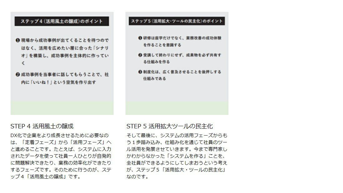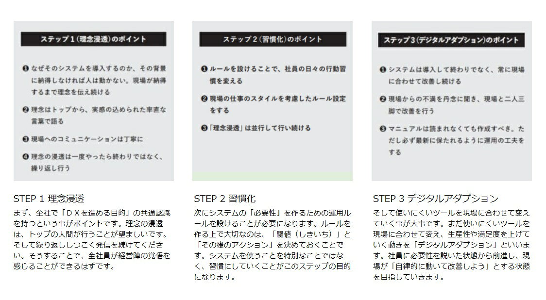 本書では、著者が確立したDX化のノウハウを「理念浸透」「習慣化」「デジタルアダプション」「活用風土の醸成」