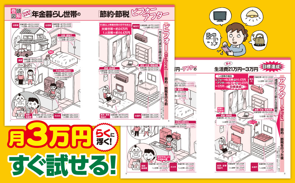 本書は、電気代・ガス代の光熱費や水道代はもちろん、毎日の食費、住居費、医療費、薬代、介護費、保険料、スマホ代、インターネット代、車の維持費などの節約法、さらには納めた税金が還付される節税法もくわしく紹介。