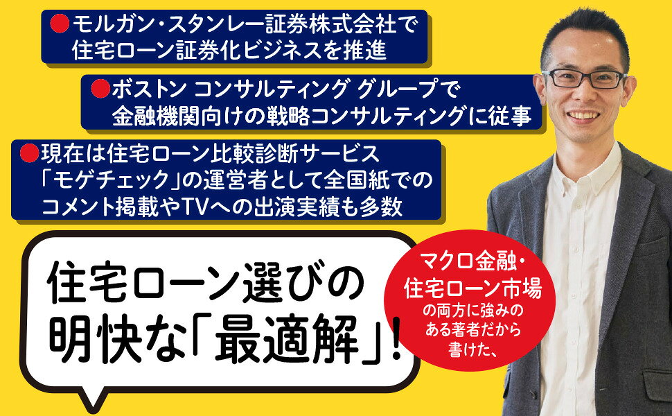 モルガン・スタンレー証券で住宅ローンの証券化ビジネスを推進したのち、現在は住宅ローンのポータルサイト「モゲチェック」を運営する著者だから書けた、新時代のリテラシーをまとめた1冊。変動金利でローンを組んでいる人は「安心」を、固定金利の人は借り換えで「数百万円」を得られる内容をぜひご確認ください。