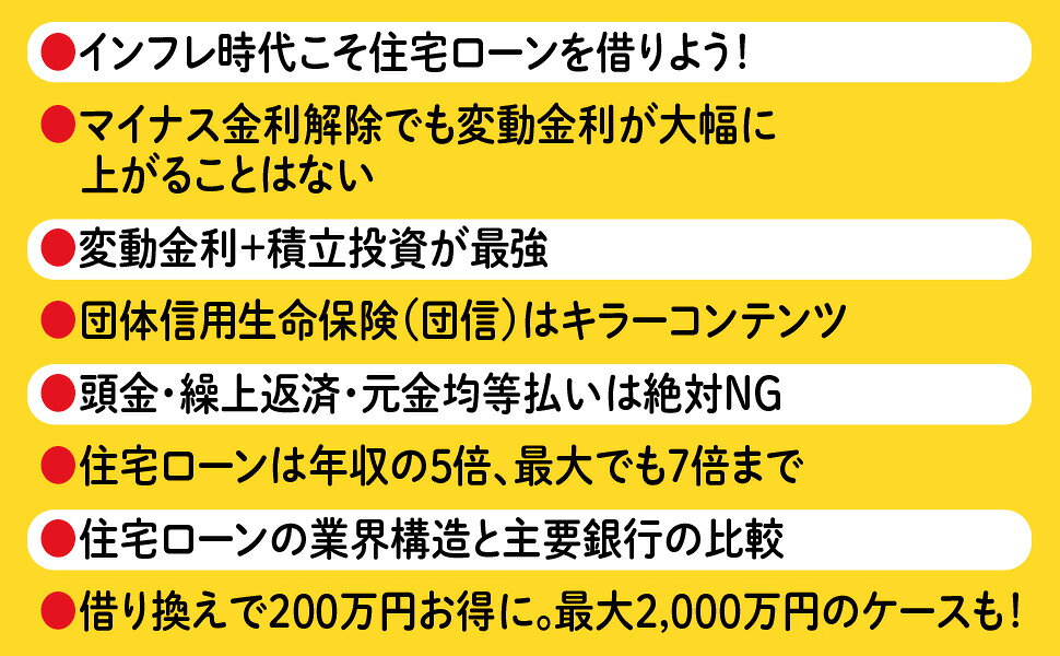 第1章 新時代のお金の常識/第2章 住宅ローンは実は借りると儲かる/第3章 住宅ローンの一番お得な借り方・返し方/第4章 金利の仕組みと将来の見通し/第5章 金利が上がっても、住宅ローンは「変動が有利」といえるわけ/第6章 ローン返済中なら一度は考えるべき「借り換え」とは?/第7章 これだけは知っておきたい!住宅ローンのよくある疑問を解決/第8章 どの銀行がおすすめ?