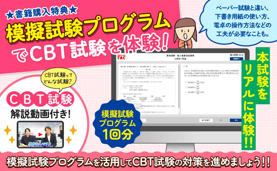 本書では、読者特典としてCBT試験を体験できる「模擬試験体験プログラム」をご用意!本番ソックリの画面なので、本試験でも焦らずに望めます。また、TACの人気講師がCBTのメソッドを大公開します。