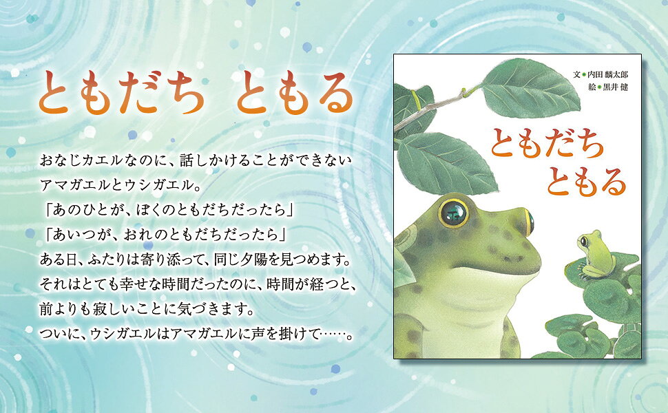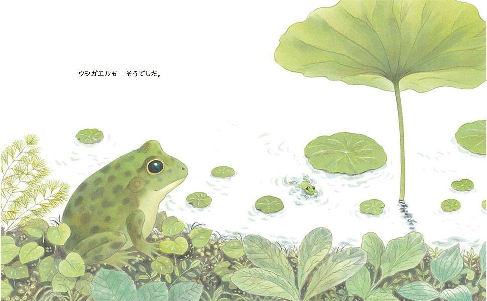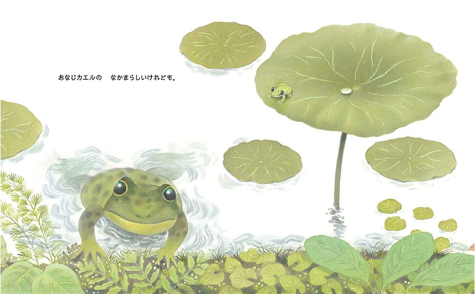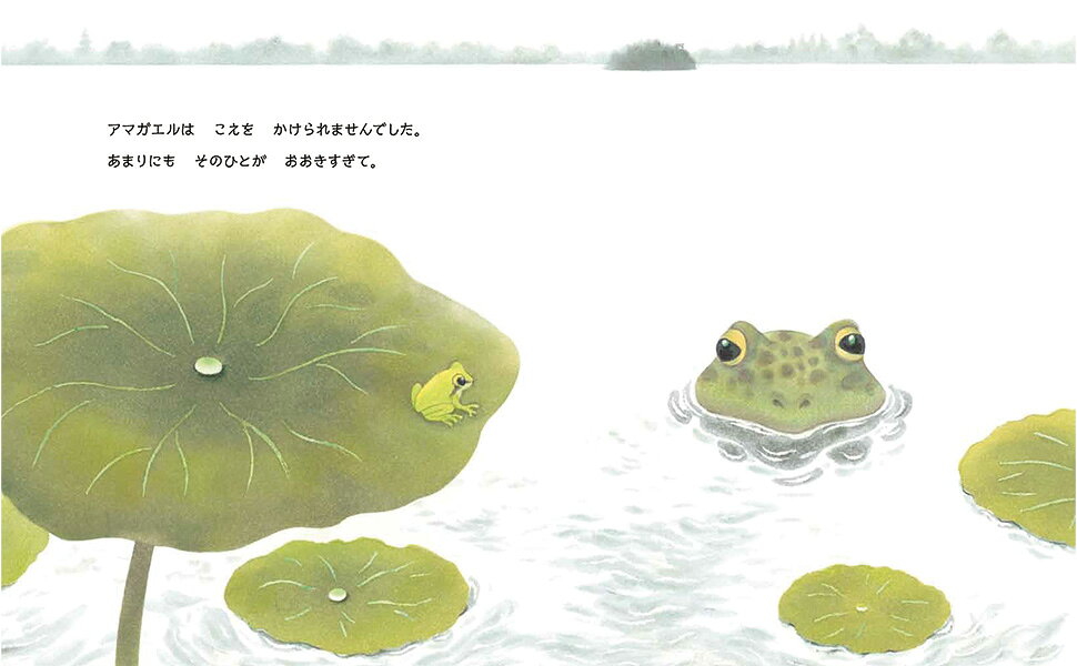 ともだちにあえたひは、かぜもうたいます。ちいさなアマガエルとおおきなウシガエル。なかなかともだちになれなかったふたりですが…。