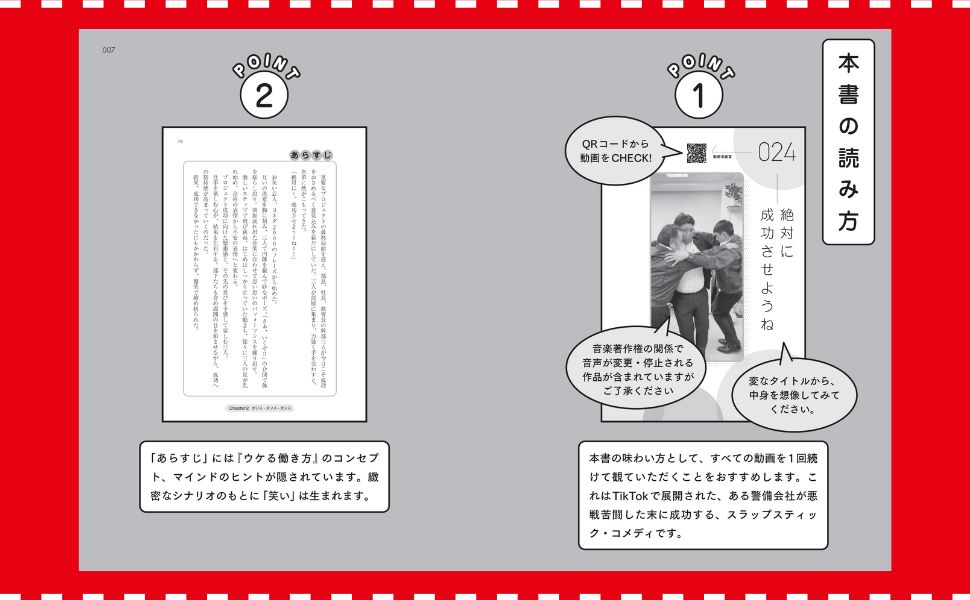 本書の味わい?として、すべての動画を1回続けて観ていただくことをおすすめします。これはTikTokで展開された、ある警備会社が悪戦苦闘した末に成功する、スラップスティック・コメディです。 「あらすじ」には『ウケる働き?』のコンセプト、マインドのヒントが隠されています。