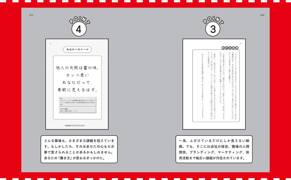 ??、ふざけているだけにしか?えない動画。でも、そこには会社の経営、職場の?間関係、ブランディング、マーケティング、採?活動まで幅広い課題がを内包されています。どんな職場も、さまざまな 課題を抱えています。もしかしたら、それは?分??の?もち次第で変えられることもあるかもしれません。読み?の「働き?」が変わるきっかけになることを期待しています。