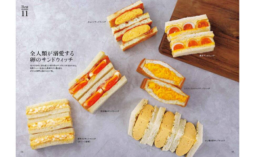 まずは、アメリカンクラブハウスサンドウィッチ、卵サラダサンドウィッチ、ミックスサンドウィッチの3つの定番サンドウィッチについて、重ね方や切り方のコツなどを丁寧にご紹介します。 さらに、「衝撃的に旨いサンドウィッチ界極上のベストイレブン」として、ラムハンバーグサンドイッチやあじのたたきサンドウィッチ、卵を使ったサンドウィッチ(5種)、ヴィーガンサンドウィッチ、フルーツサンドイッチなどを取り上げています。