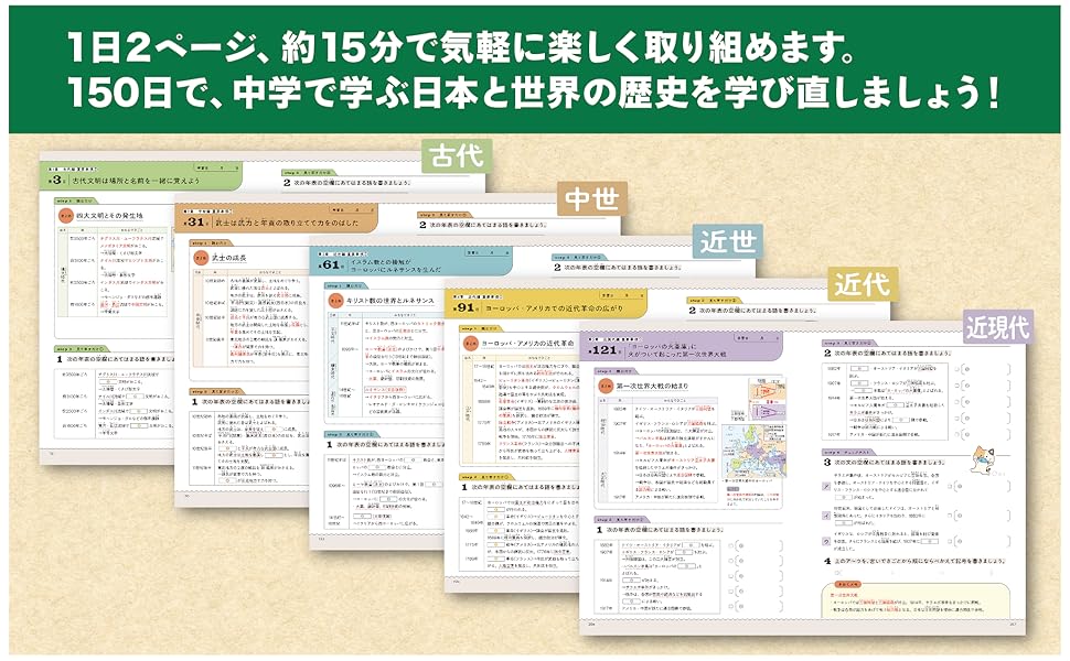 ・1日見開き2ページ、約15分の学習で、手軽に楽しく学ぶことができます。150日で、中学校で学ぶ日本と世界の歴史の流れが総ざらい。