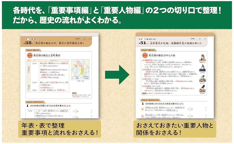 ・古代、中世、近世、近代、近現代の各時代を「重要事項」「重要人物」という二つの切り口でわかりやすく整理。年表・図解のまとめを見ながらくり返し書き写すだけで、重要用語や重要人物が覚えられます。