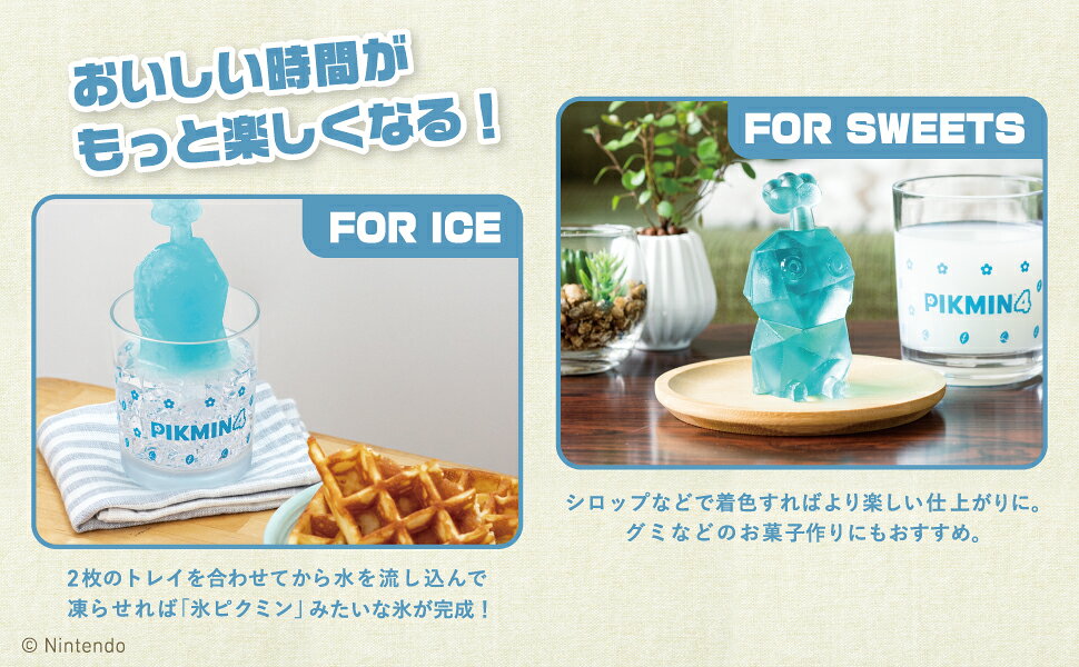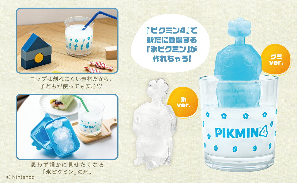 製氷器のシリコン型は、氷だけでなくグミなどのお菓子の型にも使用可能です。「ピクミン4」のロゴとピクミンたちが描かれたオリジナルデザインのコップは、割れにくい素材を使用している安心設計。