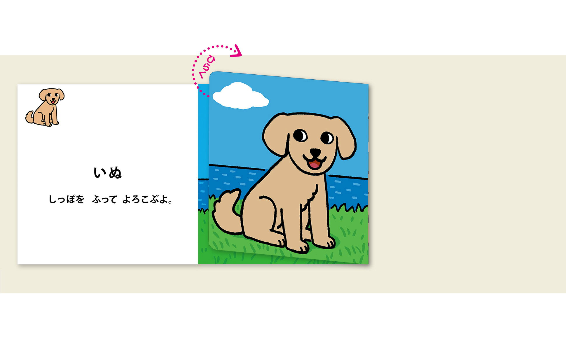 子どもたちに人気のかわいい動物たちが大集合! しかけをめくると動物たちが、いきおいよく動き出すよ。本作では、いぬ、ねこ、ぱんだ、りす、うさぎ、さる、ぺんぎん、いるかが登場。動物の特徴やすんでいる場所もひと目でわかります。読み聞かせしやすい鳴き声やオノマトペも盛りだくさん! 動物園に行く前、行った後に読むのもおすすめです。