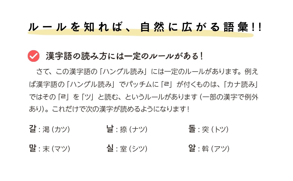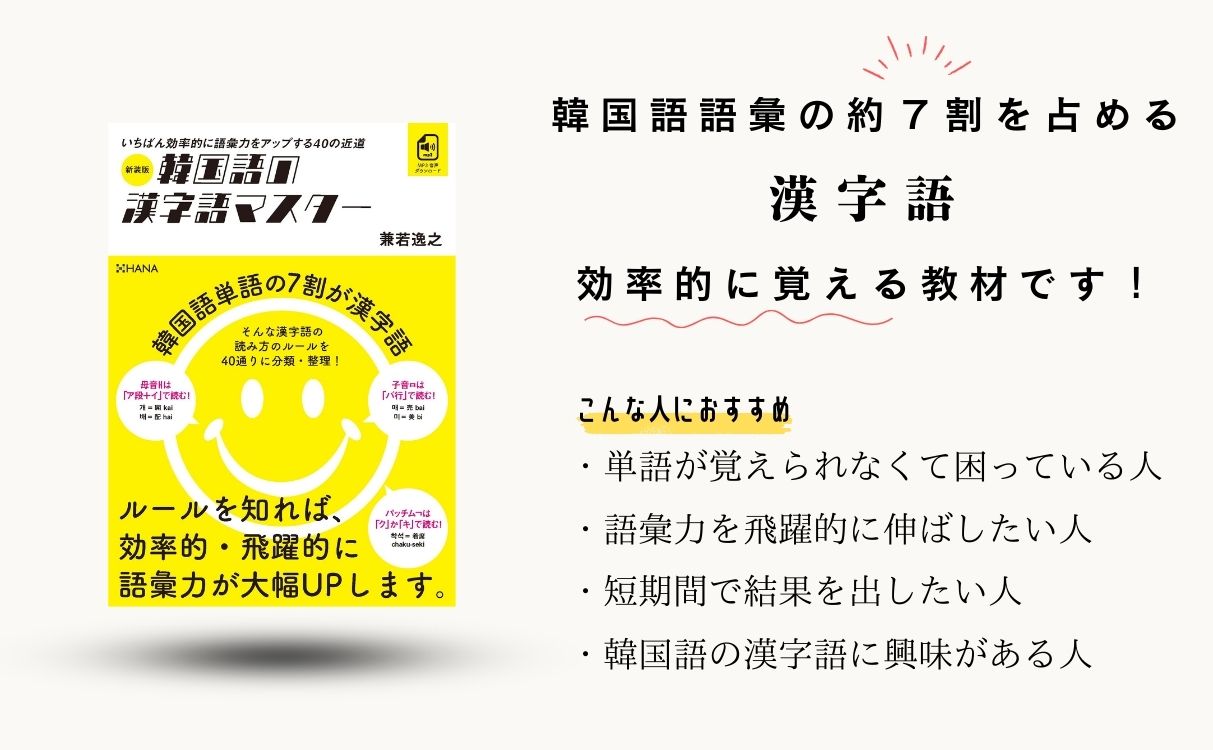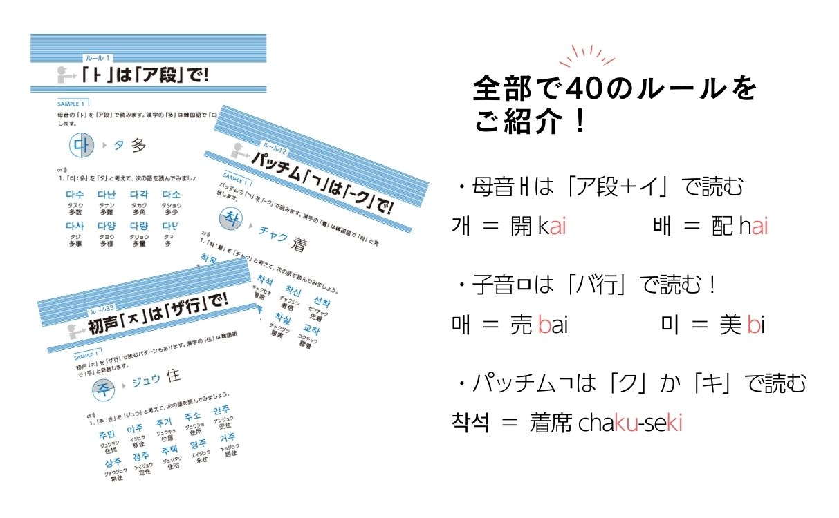 韓国語単語の7割が漢字語。そんな漢字語の読み方のルールを40通りに分類・整理!ルールを知れば、効率的・飛躍的に語彙力が大幅UPします。
