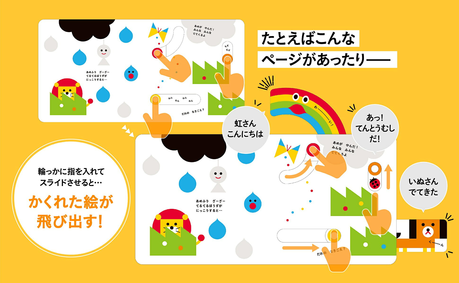 輪っかに指を入れてスライドさせると…かくれた絵が飛び出す!たっぷり遊べる動く絵本。