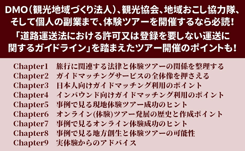 1 旅行に関連する法律と体験ツアーの関係を整理する/2 ガイドマッチングサービスの全体像を押さえる/3 日本人向けガイドマッチング利用のポイント/4 インバウンド向けガイドマッチング利用のポイント/5 事例で見る現地体験ツアー成功のヒント/6 オンライン(体験)ツアー発展の歴史と作成ポイント/7 事例で見るオンライン体験成功のヒント/8 事例で見る地方創生と体験ツアーの可能性/9 実体験からのアドバイス