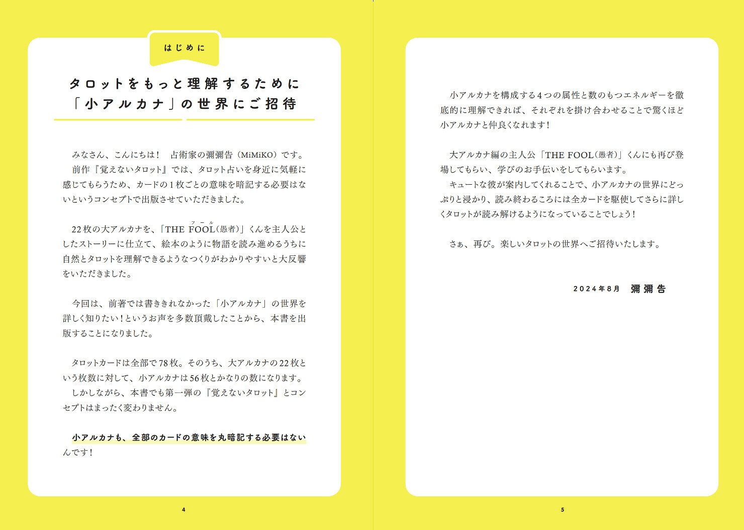 1 小アルカナの世界へようこそ(小アルカナの構成はトランプに似ています/小アルカナを知る最も大事な基本 4つの属性/小アルカナと数字との関係 ほか)/2 小アルカナチャート表を徹底理解!(掛け合わせのイメージができれば、答えが見えてくる/チャート表の活用ヒント/チャートの読み方実践講座)/3 スプレッド(展開法)で占ってみよう!(もっと読み解くための手順)/4 彌彌告はこう読む!読み解き実例(恋愛編1-純愛の方向性さえ変えれば、すぐに恋はやってくる!/恋愛編2-占いの結果より、何気ない一言が人を救うことがある!/人間関係編ー占星術とのつながりが深いタロットが教えてくれた最適な時期! ほか)