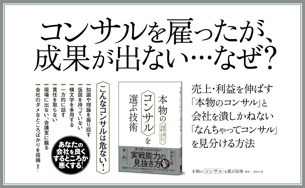 「期待と違った…」。会社の売上アップやコスト削減を期してコンサルを雇ったが、期待に反して全く使い物にならなかったと嘆く経営者は多い。理論には強いが、実践は苦手なコンサルが思いの外多いからだ。お金と時間をムダにしないためにも、経営者やリーダー層はコンサルを見抜く技術が必要だ。社員だって、コンサルの言うことを鵜呑みにしてはいけない。現場で割を食うのは自分たちだからだ。伝説のトップコンサルとして活躍した著者だからこそ言える「コンサルの実力を見抜き、選ぶ技術」とは?