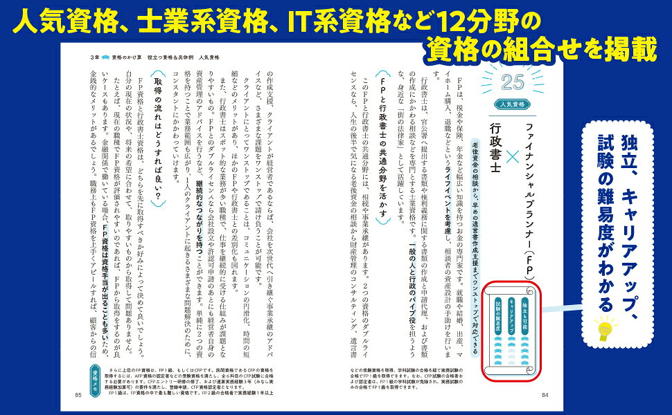 本書では、今持っている資格とどの資格をかけ合わせれば存在価値を高められるかといったヒントを数多くご紹介していきます。逆にどの道に進もうか迷ってしまうかもしれません。それくらい、資格のかけ合わせに関する情報を盛り込んでいます。新たに挑戦する資格との出会いを楽しみながら、自分の将来について考えてみませんか。