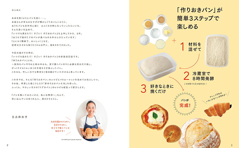 「おうちパン研究家」吉永麻衣子さんの考案した「作りおきパン」レシピをまとめました。パン作りといえばいろいろな道具や手間が必要で難しそう、作ってみたいけれど、ハードルが高いと思う方も多いはず。作りおきパンは保存容器に材料を入れて、混ぜてこねるだけ! 特別な道具も、難しいコツもいりません! 食べたいときにいつでも焼きたてが食べられる! バリエーション豊富でパン作りが楽しくなる一冊です。