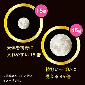 初めてでも天体を視野に入れやすい15倍。視野いっぱいに月が大きくなる45倍。2種類の倍率で天体観測を楽しめます。接眼レンズは光学ガラス製。